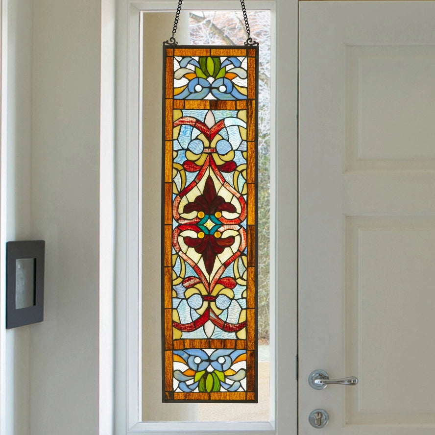 Beautify your windows with this stained glass Fleur De Lis window panel. Enjoy the morning sun and brighten up any room with a kaleidoscope of colors. Each panel comes with a decorative hanging chain for support and strength so that you can easily install it and enjoy. This 36"H vertical shaped stained glass suncatcher is perfect for your glass panel next to your front door, kitchen window or dining room space. Perfect addition to your fall decor. Catch the sunlight with this lovely Fleur De Lis, handcrafted stained glass window panel and add happiness to any room in your home. Tiffany Style hand cut glass with a decorative hanging chain for displaying. Display sun catchers in windows, as wall hangings, or next to your front door. Patterned traditional Fleur De Lis themed art adds to a kitchen or in any living space. Overall Dimensions: 9.5"L x 0.25"W x 36"H Clean with damp cloth or lemon oil polish; dry with clean, dry cloth