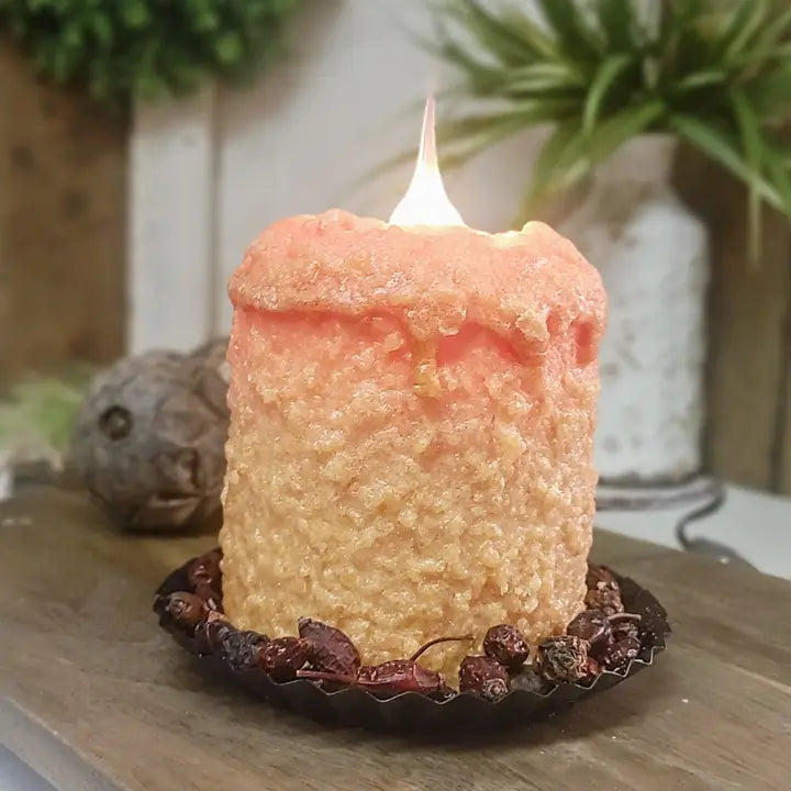 It has our timeless signature, lumpy bumpy exterior, and provides a beautiful glow to any room when lit. Size: 5″ tall x 4.5″ diameter weight: 2 lbsFormula: 100% cotton wick, paraffin wax4-5 watt silicone bulb included. Handmade in the USA, packaged in a clear bag with a Warm Glow label and twist tie. Do not place directly on furniture or other surfaces. Always use a container or plate underneath.